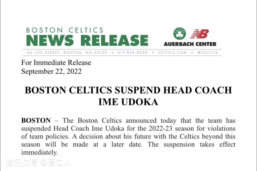 北京时间9月23日,凯尔特人官方公布了对主帅乌度卡的处罚结果。跟此前名记woj爆料的一样,他直接被禁赛一整季,无缘执教2022-23赛季。乌度卡致歉,并且接受处罚。